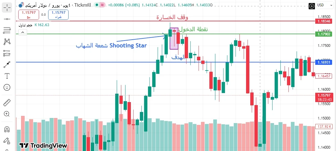 مثال عملي: كمثال عملي لتداول شمعة الشهاب، تكون نقطة الدخول بعد إغلاق الشمعة الهبوطية، حيث يُوضع أمر البيع عند مستوى الإغلاق أو أقل بقليل، مع تحديد وقف الخسارة مباشرة أعلى الشمعة، وتعيين الهدف بنسبة ربح إلى مخاطرة 1:2، فمثلاً إذا كانت المسافة بين الدخول ووقف الخسارة 20 نقطة، يكون الهدف 40 نقطة.